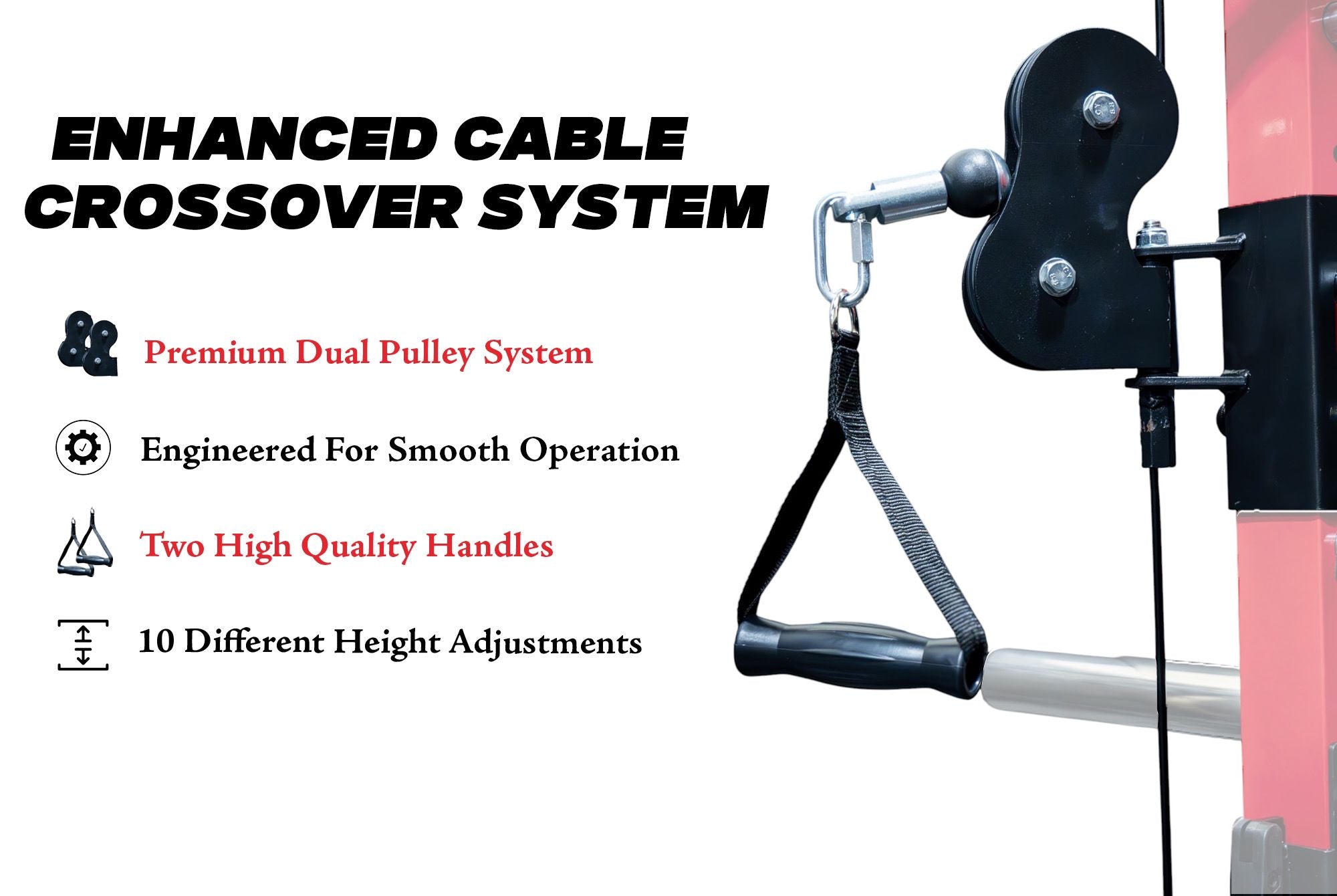 Equipped with a dual cable crossover system and a landmine attachment, this machine allows you to perform dozens of exercises including cable flys, triceps extensions, rotational presses, and more. It’s also built for convenience with J Hooks and extended safety bars, letting you adapt your setup quickly to different lifts and user heights. From heavy compound movements to targeted isolation work, this machine keeps your workout dynamic and flexible.