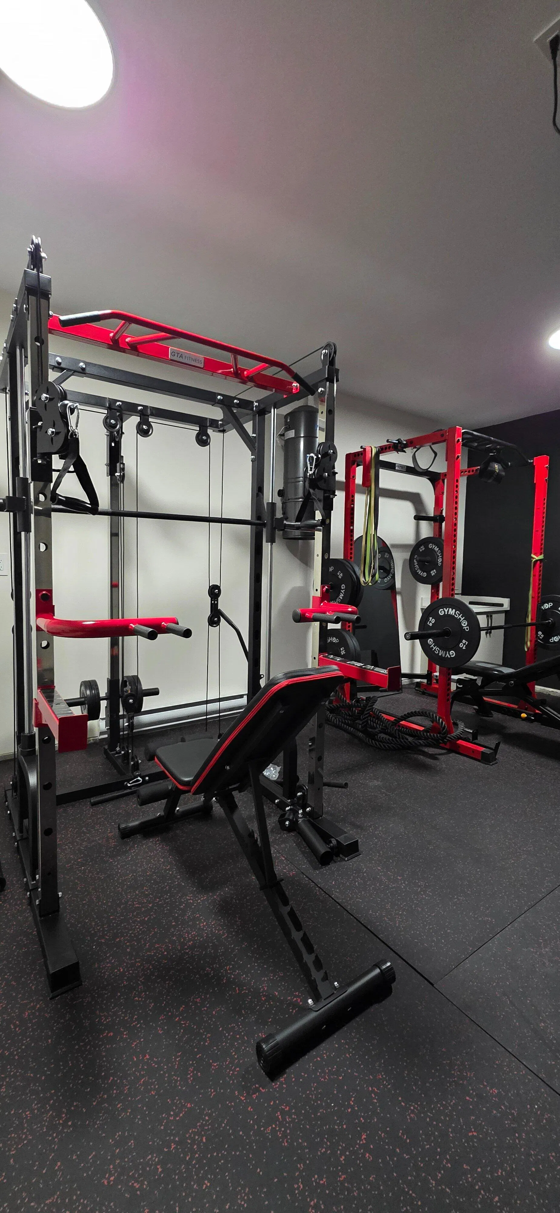 The GTA Fitness All-in-One Smith Machine integrates a secure Smith bar, dual pulley system, and multiple attachments, enabling a comprehensive range of exercises including squats, presses, curls, and more. Its compact footprint makes it ideal for home gyms without compromising on functionality.