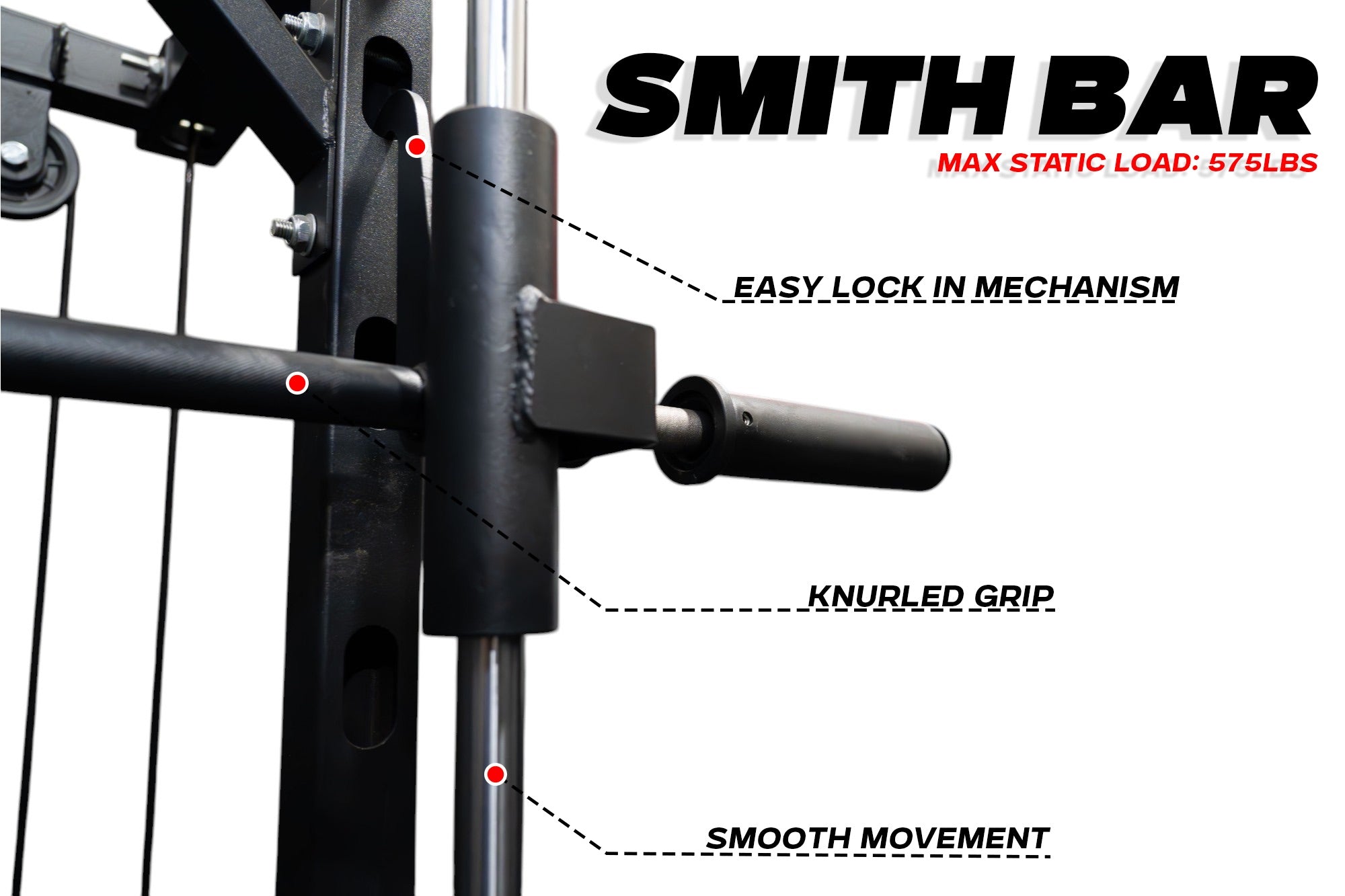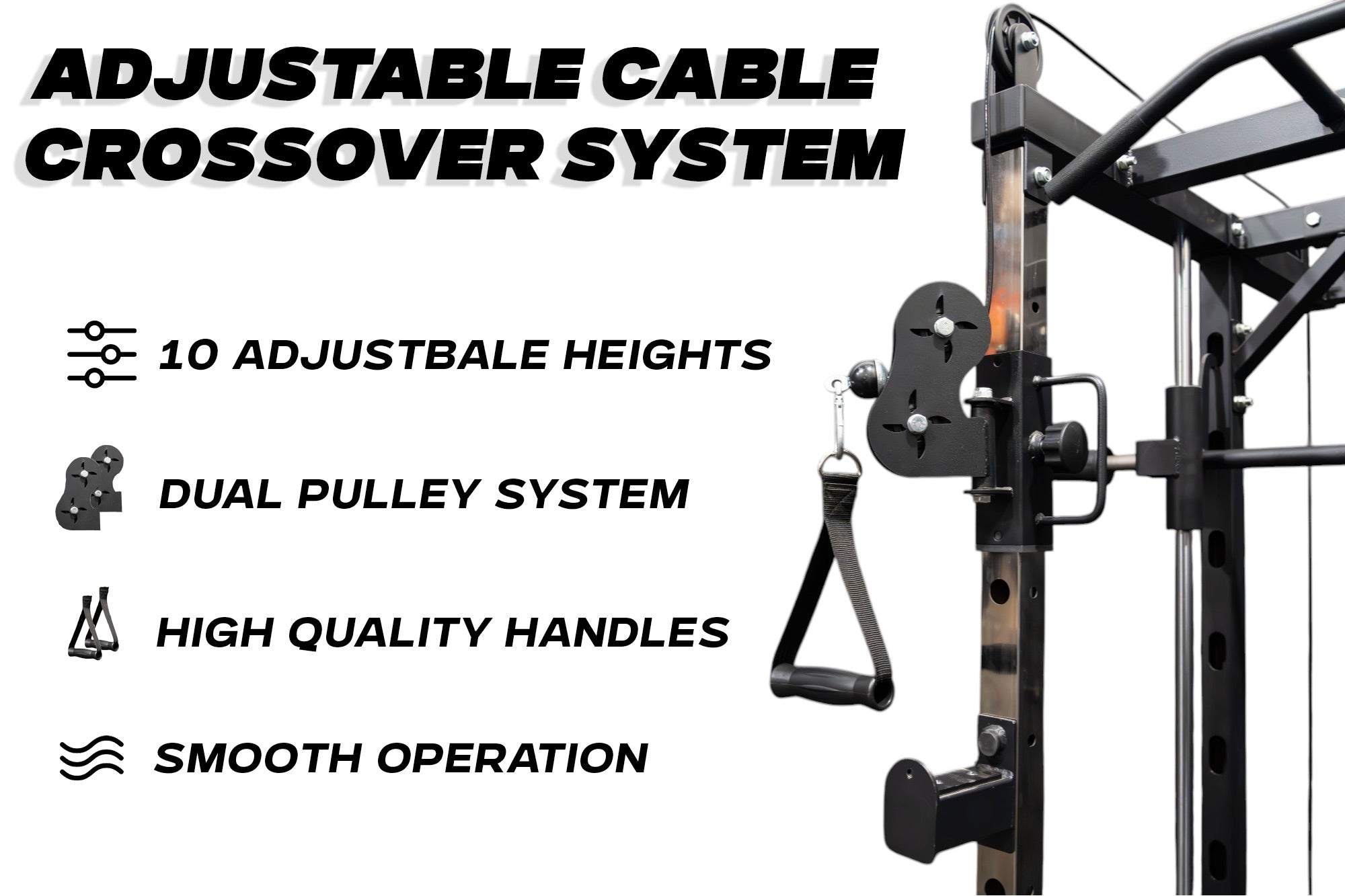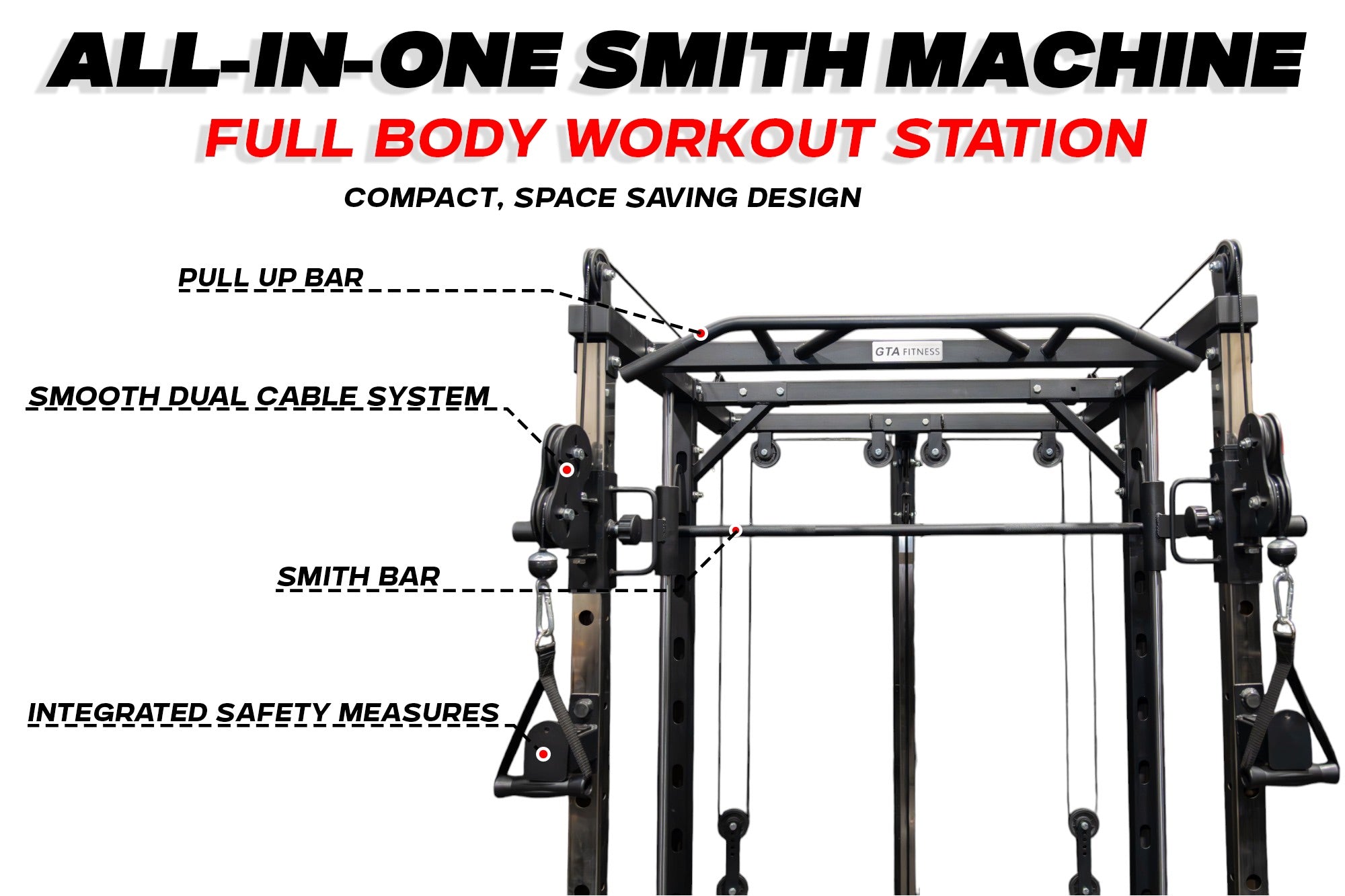 The GTA Fitness All-in-One Smith Machine integrates a secure Smith bar, dual pulley system, and multiple attachments, enabling a comprehensive range of exercises including squats, presses, curls, and more. Its compact footprint makes it ideal for home gyms without compromising on functionality.